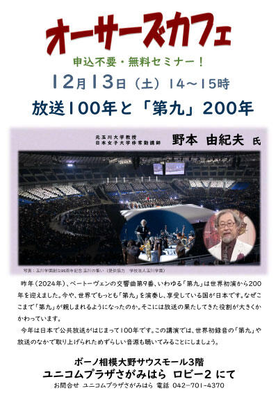 昨年(2024年)、ベートーヴェンの交響曲第9番、いわゆる「第九」は世界初演から200年を迎えました。今や、世界でもっとも「第九」を演奏し、享受している国が日本です。なぜここまで「第九」が親しまれるようになったのか。そこには放送の果たしてきた役割が大きくかかわっています。今年は日本で公共放送がはじまって100年です。この講演では、世界初録音の「第九」や放送のなかで取り上げられためずらしい音源も聴いてみることにしましょう。