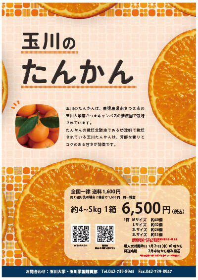 今回も引き続き、その玉川大学南さつまキャンパス清原園で栽培したタンカンを玉川学園購買部から販売いたします。