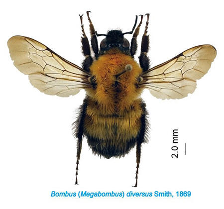相場博明名誉教諭は、化石はマルハナバチ属のものであると同定し、ミツバチの専門家である玉川大学の小野正人教授に研究の協力を依頼しました。その結果、化石は現在の日本に生息するトラマルハナバチ(図1)にもっとも形態が似ていることからトラマルハナバチ比較種と同定されました。