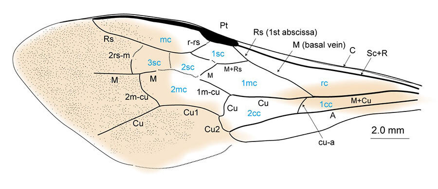 図3 翅脈のスケッチよって、今回の約30万年前の中期更新世の地層からのマルハナバチの化石の発見は、その生物の種レベルでの進化を探る上で貴重な資料になります。