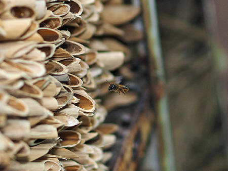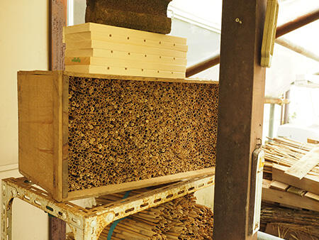 ツツハナバチ属のハチでは、オスが翅を震わせて音や振動を出すなど、他のハナバチには見られない独特な配偶行動があることが知られています。この振動や音は、メスとの交尾を促す「求愛信号」としての機能があるだけではなく、オスの資質を示す信号となっていると考えられていますが、日本産の種でその詳細が調べられた例はありませんでした。また、どのようなメスが交尾するのかについての知見もありませんでした。今回の研究は、玉川大学構内に巣場所として設置したアシ筒(図3)から得られたツツハナバチを用いて、オスの配偶行動とメスの受容性の詳細を調べたものです。