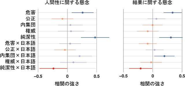 これらの道徳基盤と懸念の2つのカテゴリーとの関係を見ると、いずれのカテゴリーに対しても、「危害」と「純潔性」の道徳基盤が強い影響を与えていた。日本語話者は「内集団」の道徳基盤が結果に関する懸念と関連してたが、英語話者では「純潔性」の道徳基盤が日本語話者より強い影響を与えていることが分かった(図1)。