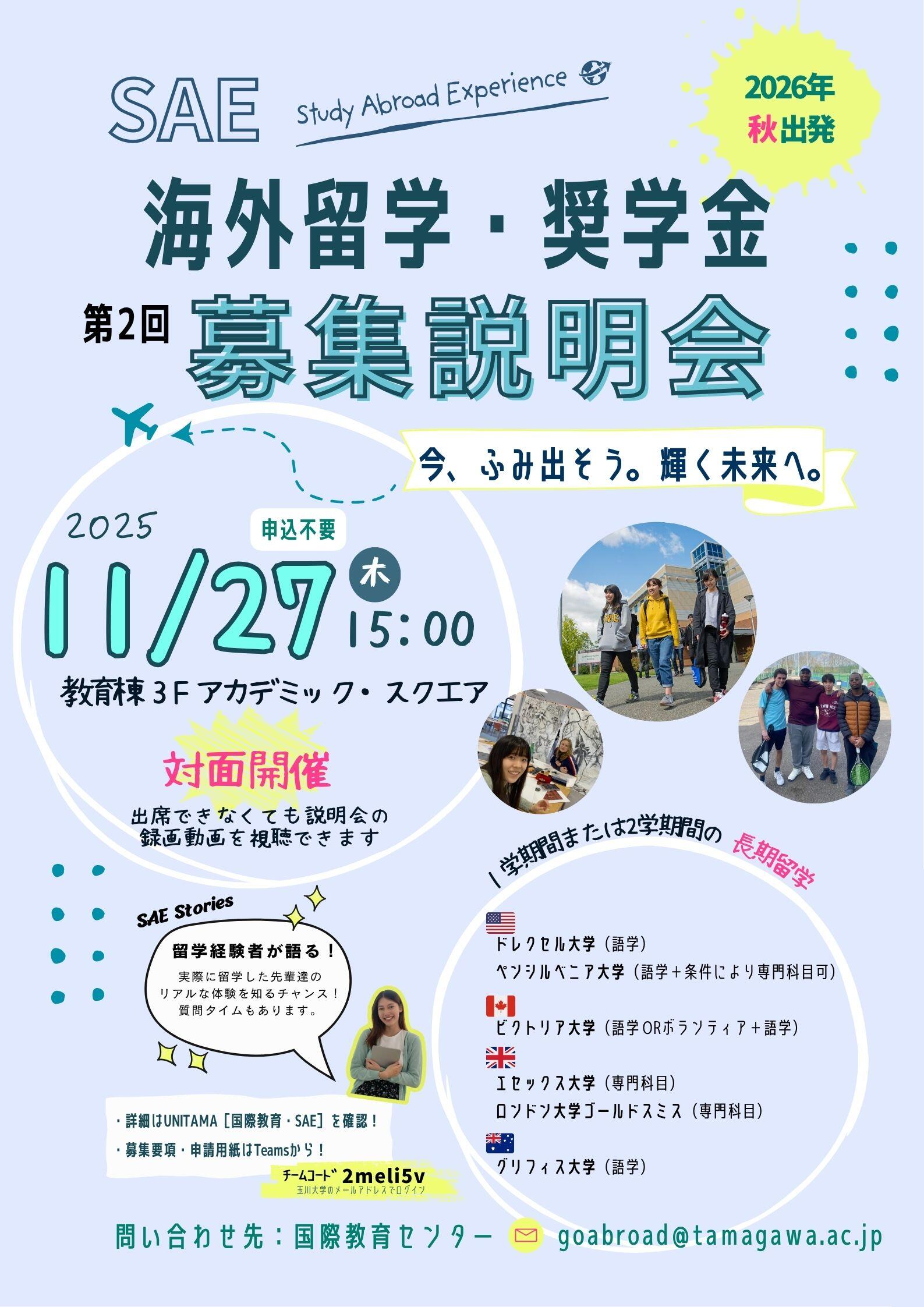 SAE 海外留学プログラム・奨学金(2026年秋出発)の募集説明会を対面で実施します。