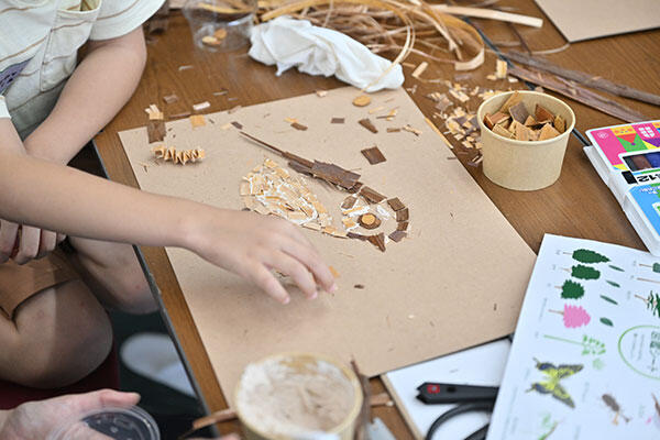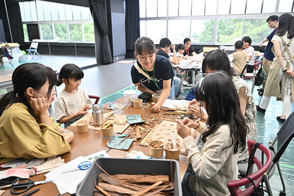 間伐材の樹皮を使ったクラフト制作を通じて、森の手入れの大切さを学びました。完成作品は展示され、参加者同士が活発に意見交換を行う場面も見られました。