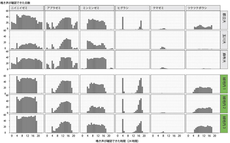 - 自動録音装置を用いて、東京・神奈川の都市域3地点、緑地域3地点で、2024年6月下旬から8月末まで24時間を通してセミの鳴き声を連続観測しました。