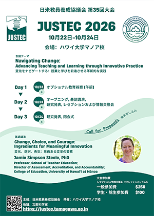 玉川大学が日本側の基幹大学をしている日米教員養成協議会 第35回大会(対面)のご案内です。 日米教員養成協議会(JUSTEC)は、日米の教員養成や教師教育における研究や共同研究を促進していくために、全米教員養成大学協会(AACTE)のサポートを受けて設立された協議会です。日米の教員養成/教師教育に関わる研究や実践を英語で触れる機会として、アメリカの教員養成大学との共同研究やパートナーシップにつながる機会として、また研究の機会としてご活用いただくこともできます。